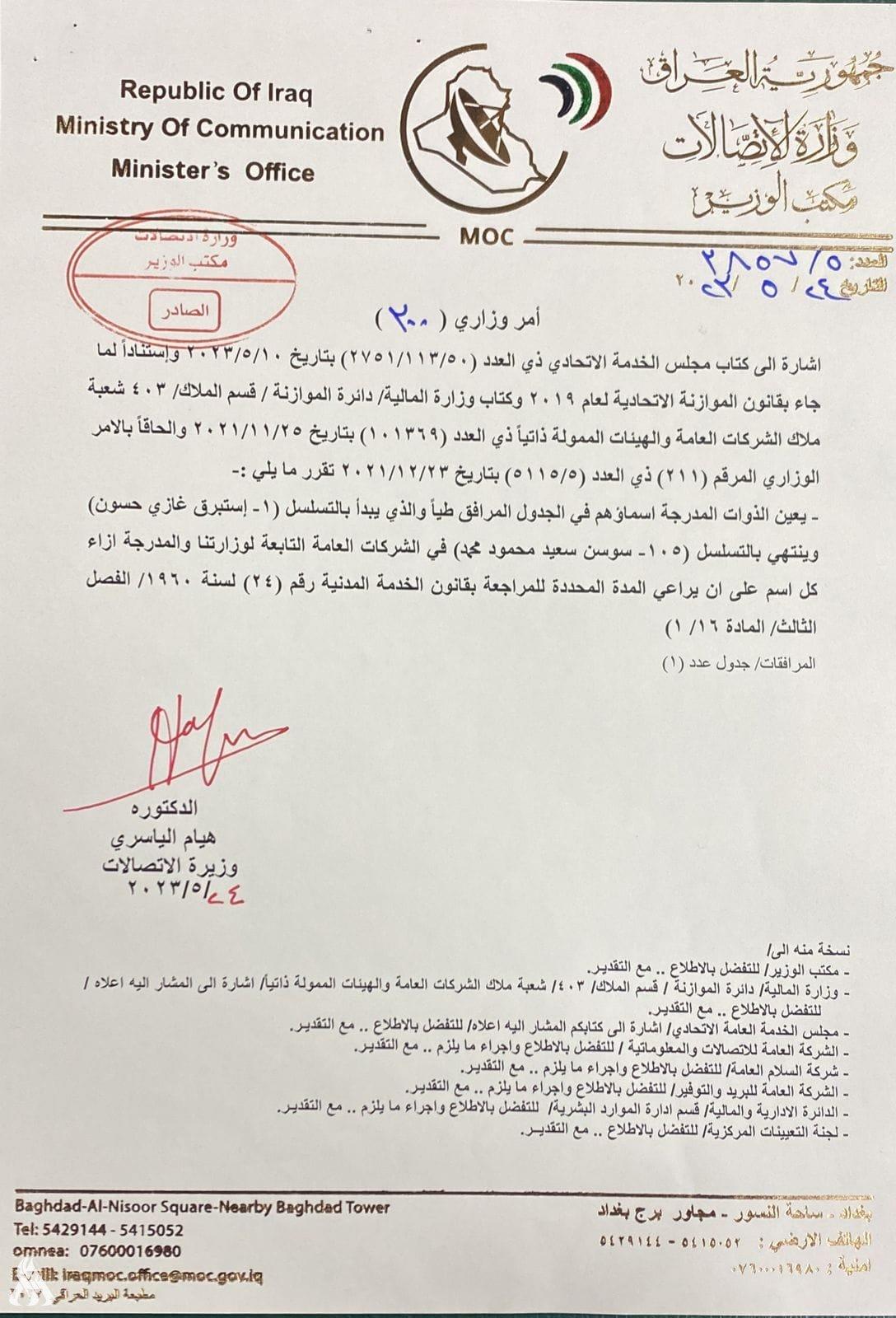 اصدرت وزارة الاتصالات، اليوم الاربعاء، امراً وزارياً بتعيين 105 موظفين على ملاك الشركات العامة للوزارة.