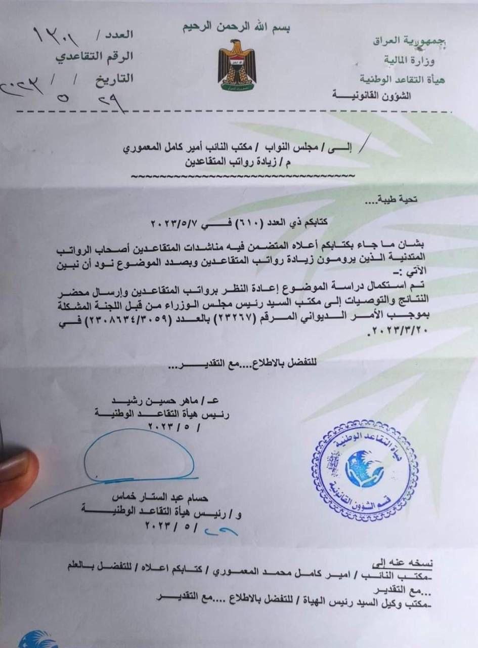 جريدة المدى > اخبار وتقارير > بالوثيقة.. التقاعد تعلن اكمال دراسة موضوع زيادة رواتب المتقاعدين