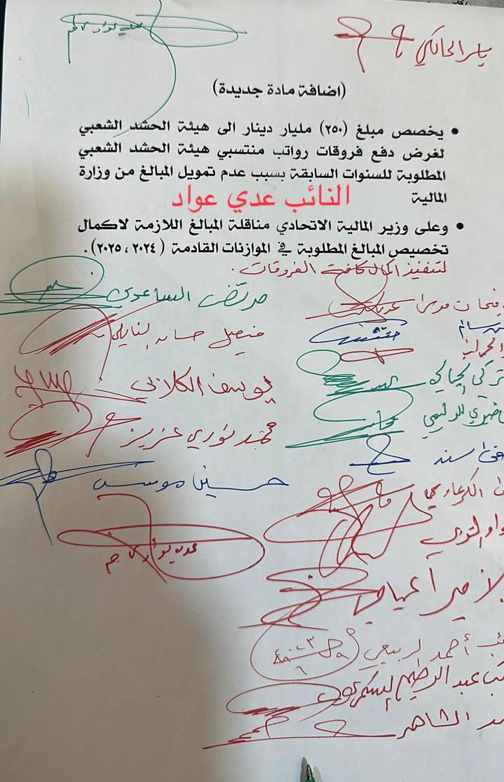 ورد لـ(المدى) وثيقة تظهر جمع تواقيع لعدد من النواب لإضافة فروقات الحشد الشعبي في الموازنة العامة.