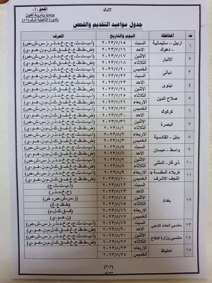 وقال الغنام في بيان تلقته (المدى)، "بعد أن تمَّ تمديد موعد التقديم للدورة التأهيلية 87 لثلاثة أيام وبسبب قبول جميع الاختصاصات ولغاية يوم 2023/7/9، أدناه مواعيد التقديم والفحوصات الجديد للدورة التأهيلية 87 في مقر الكلية العسكرية الأولى في الرستمية: