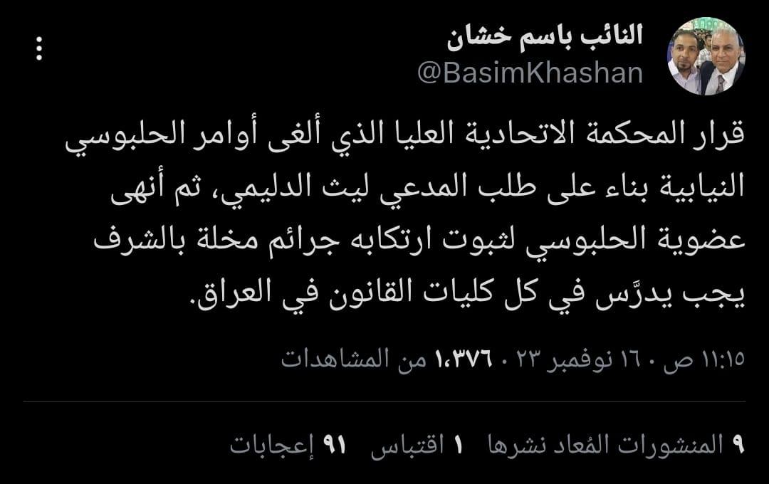 وقال خشان في تدوينة اطلعت (المدى) عليها، إن "قرار المحكمة الاتحادية العليا الذي ألغى أوامر الحلبوسي النيابية بناء على طلب المدعي ليث الدليمي، ثم أنهى عضوية الحلبوسي لثبوت ارتكابه جرائم مخلة بالشرف يجب أن يدرَّس في كل كليات القانون في العراق".
