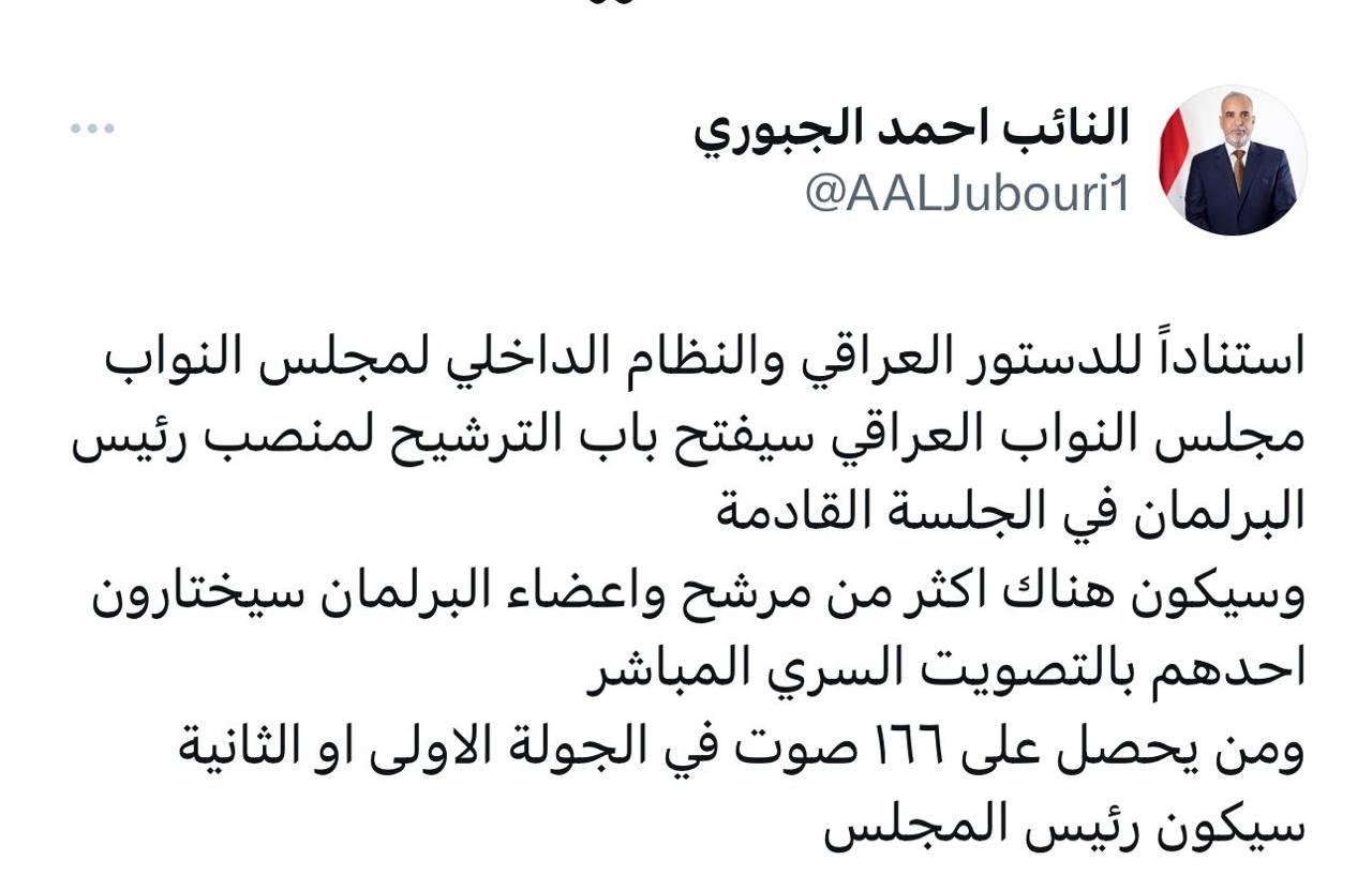 وقال الجبوري في تدوينة له تابعتها (المدى) إنه “استنادا للدستور العراقي والنظام الداخلي لمجلس النواب العراقي سيفتح باب الترشيح لمنصب رئيس البرلمان في الجلسة القادمة”.