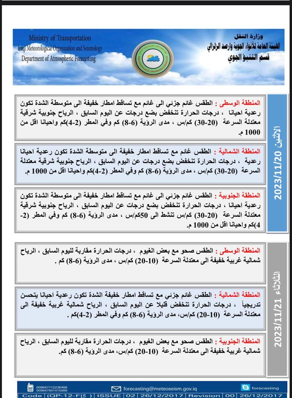 كشفت هيئة الأنواء الجوية، اليوم الجمعة، عن طقس البلاد خلال الأيام المقبلة، فيما توقعت عن تشكل ضباب خلال ساعات الصباح الأولى مع وجود فرص لهطول أمطار على أغلب مدن البلاد.