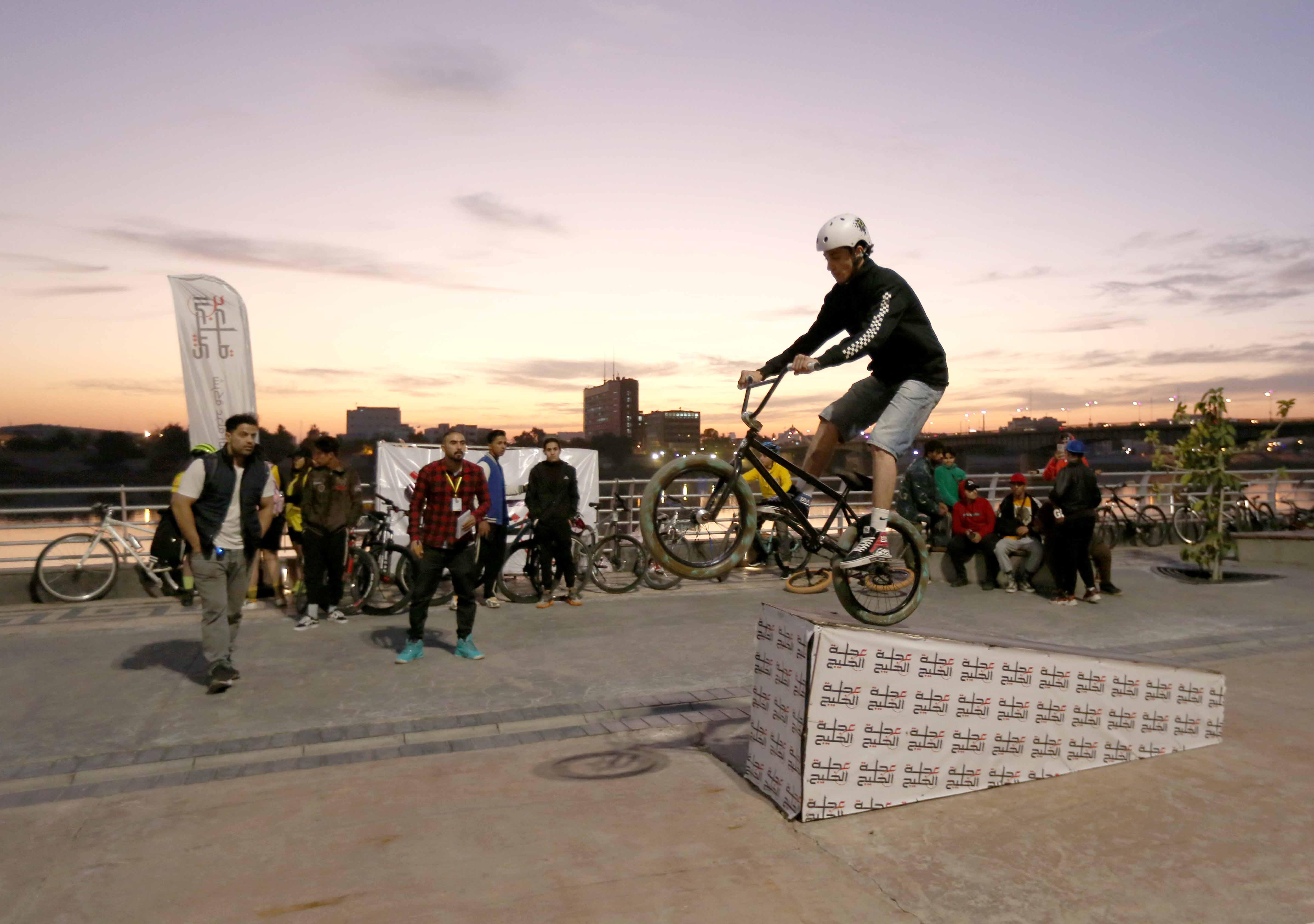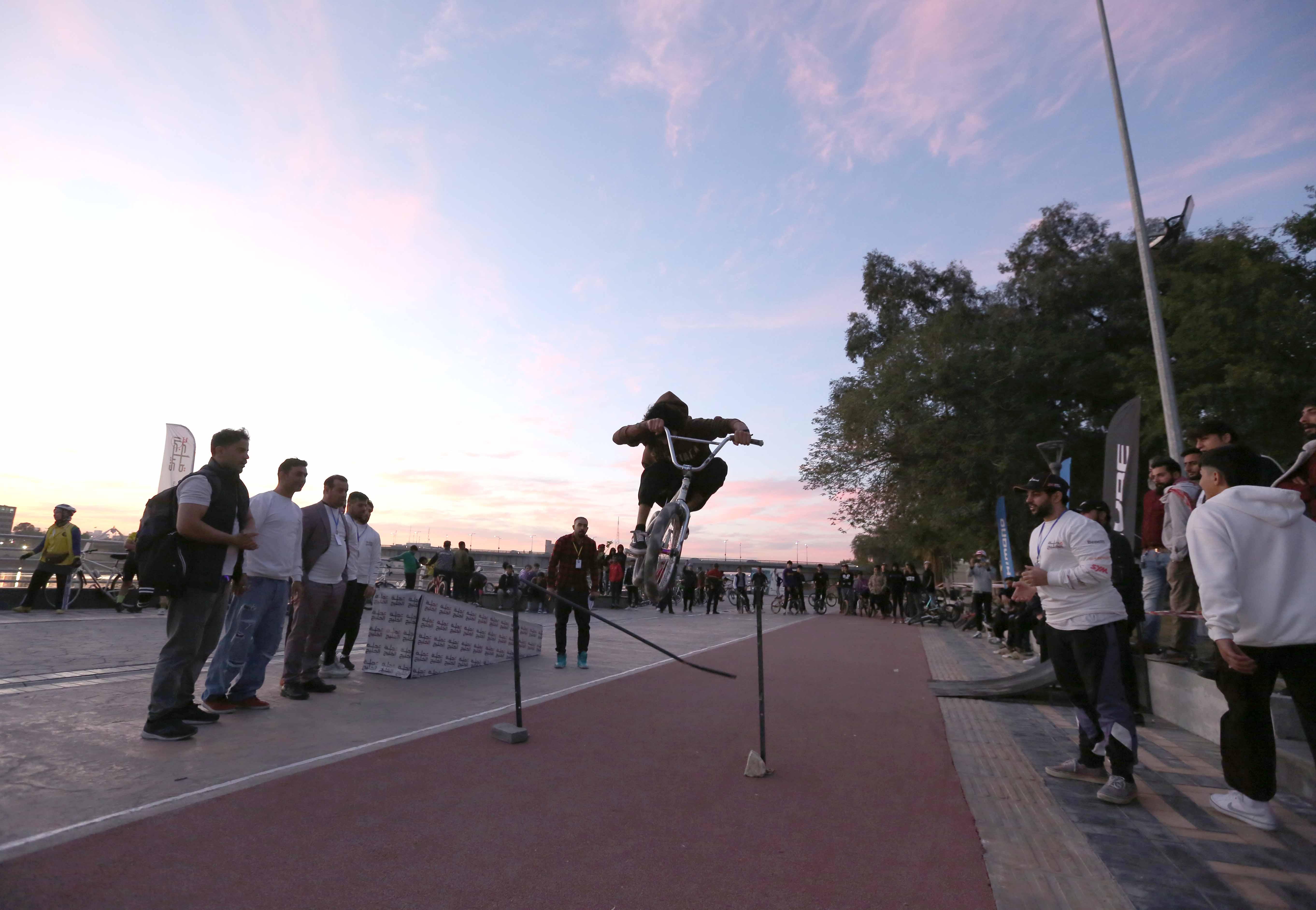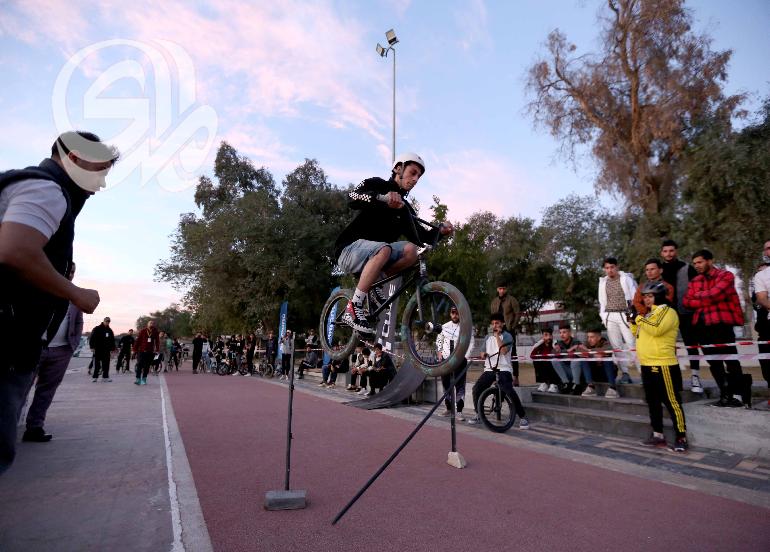 اقامت فرق عديدة من بغداد وبقية المحافظات، اليوم الثلاثاء، استعراضات قفز وحركات فنية بالدراجات الهوائية على حدائق ابو نؤاس.