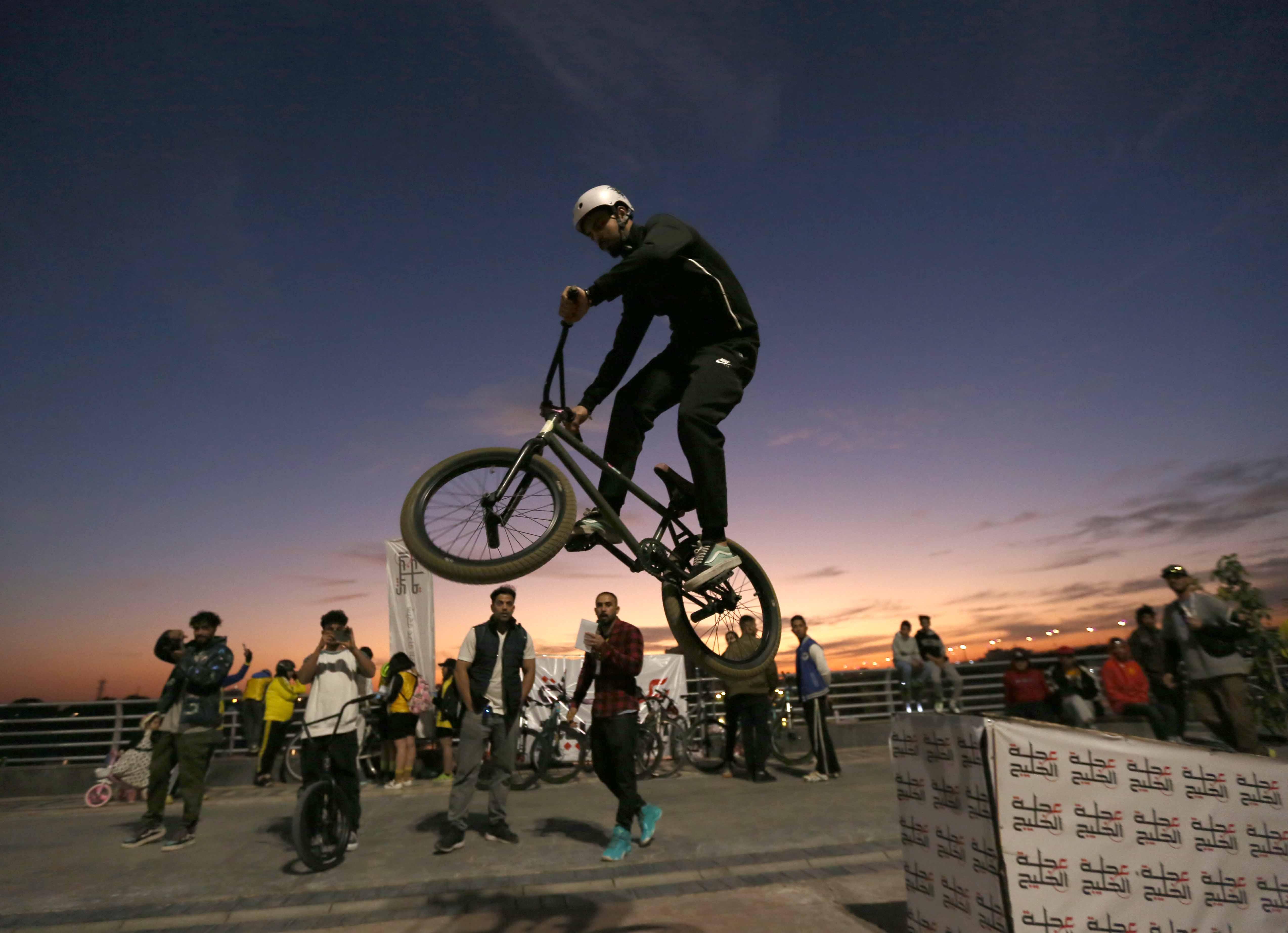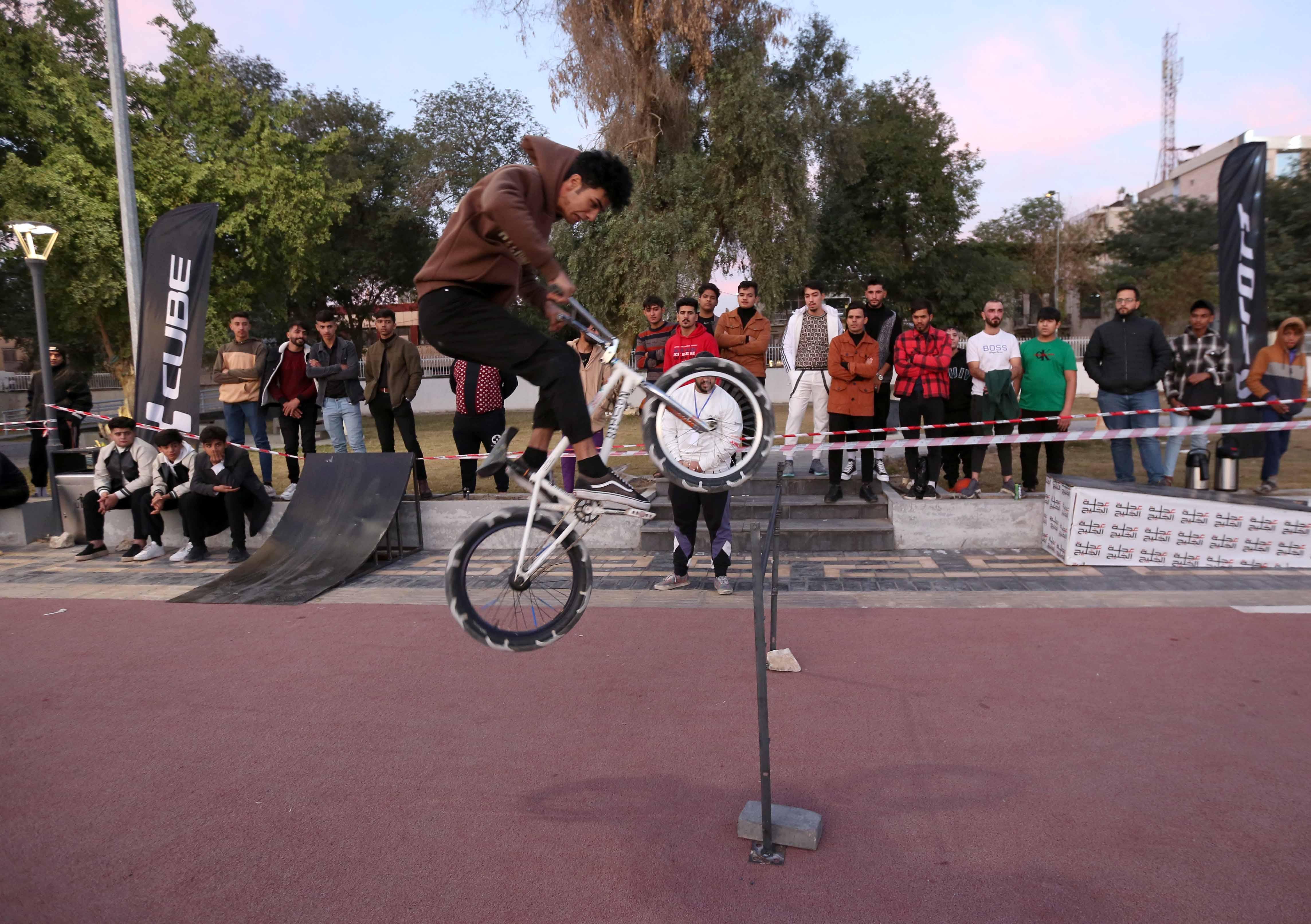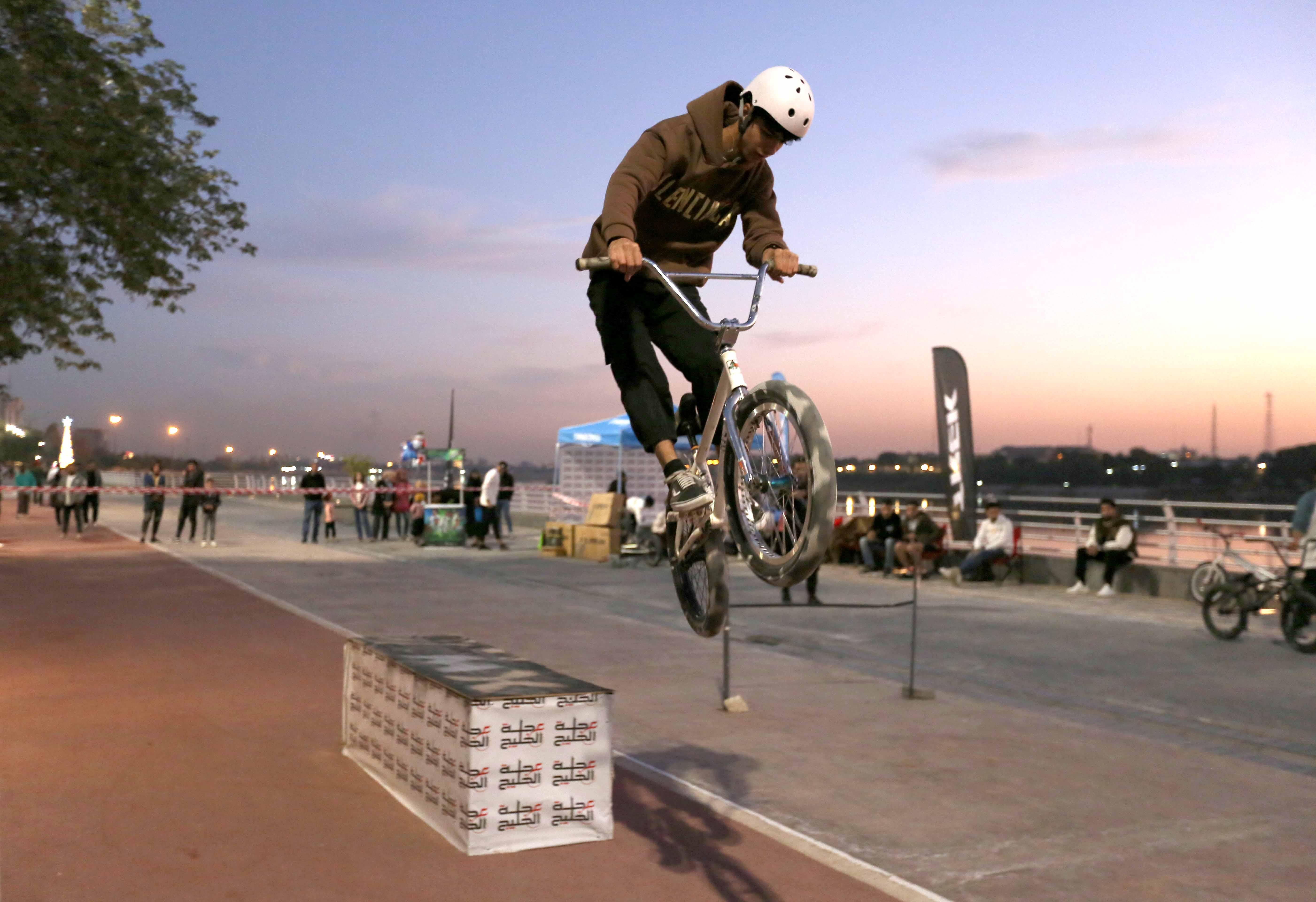 اقامت فرق عديدة من بغداد وبقية المحافظات، اليوم الثلاثاء، استعراضات قفز وحركات فنية بالدراجات الهوائية على حدائق ابو نؤاس.