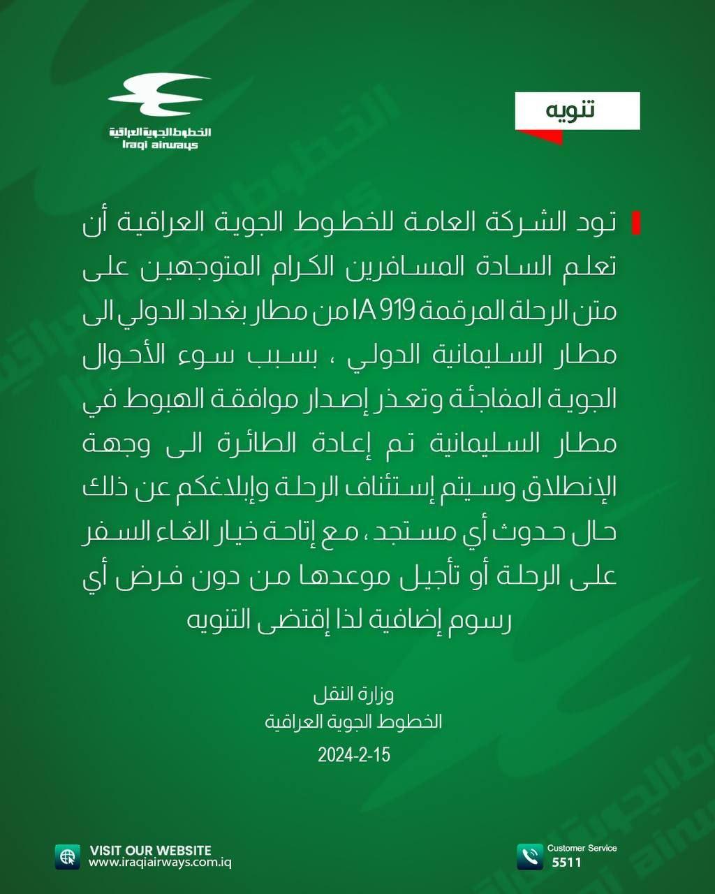 الخطوط الجوية العراقية تصدر تنويهاً يخص إحدى رحلاتها.