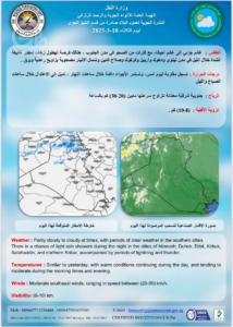 توقعت هيئة الأنواء الجوية، بهبوط الحرارة مع زخات مطرية بدءاً من الخميس.