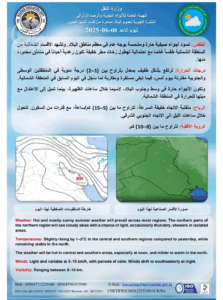 أعلنت هيئة الأنواء الجوية، اليوم الأحد، حالة طقس العراق خلال الأيام المقبلة، فيما أشار ت إلى أن الأجواء صيفية حارة بالوسط والجنوب وغائمة جزئياً مع أمطار شمالاً.
