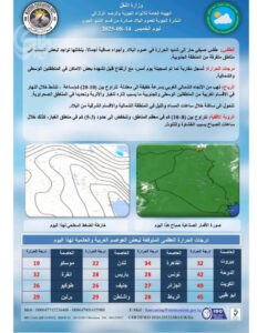 أعلنت هيئة الأنواء الجوية، اليوم الخميس، حالة طقس العراق خلال الأيام المقبلة، فيما أشارت إلى انخفاض بدرجات الحرارة بدءاً من السبت المقبل.