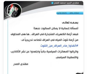 حذر زعيم التيار الوطني الشيعي، السيد مقتدى الصدر، اليوم الجمعة، من تلوث المياه في العراق.