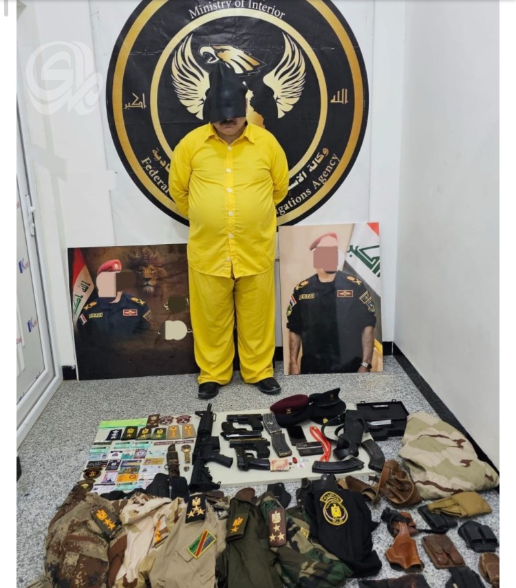 وأوضح أن "المتهم كان منتسباً سابقاً في وزارة الداخلية وتم فصله عام 2007"، لافتاً إلى أن "عملية الضبط أسفرت عن العثور بحوزته على أسلحة ومعدات عسكرية مختلفة، من بينها: 1. بندقية نوع (M4) 2. أربعة مسدسات متنوعة الأنواع إضافةً إلى بدلات عسكرية تحمل رتباً مختلفة، وباجات مزورة، وكتب رسمية ومخاطبات مزيّفة، فضلاً عن صور شخصية له وهو يرتدي الزي العسكري برتب وهمية".