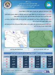توقعت هيئة الأنواء الجوية، ارتفاعاً قليلاً بدرجات الحرارة بالوسط والجنوب وتكون مائلة للبرودة في الشمال.