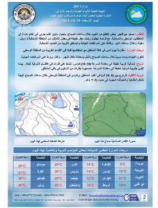 أعلنت هيئة الأنواء الجوية، اليوم الأربعاء، حالة طقس العراق فيما أشارت إلى غشاوة ناتجة عن تراكم الملوثات في الأجواء.
