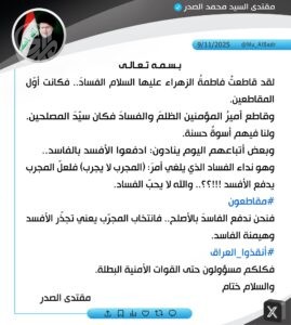 الصدر يُذكِّر بمقاطعة فاطمة وعلي ويحذر: انتخاب المجرب يعني تجذر الأفسد وهيمنة الفساد