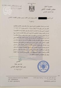 وبحسب وثيقة رسمية، أجرى المجلس تحقيقاً مع مدير المكتب بعد قيامه بصياغة الكتاب واختيار عباراته دون عرض محتواه على رئيس مجلس القضاء الأعلى أو أخذ الموافقة الأصولية، وكذلك خارج نطاق ما ورد في مطالعة رئيس هيئة الإشراف القضائي.