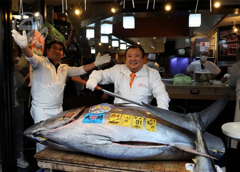 ودفع كيوشي كيمورا، الذي يُلقّب نفسه بـ«ملك التونة»، والذي فازت سلسلة مطاعمه «سوشي زانماي» بالمزاد، هذا المبلغ مقابل السمكة التي يبلغ وزنها 243 كيلوغراماً وجرى اصطيادها قبالة الساحل الشمالي الشرقي لليابان. ويُعَدُّ مبلغ 510.3 مليون ين الذي بِيعت به السمكة هو الأعلى منذ بدء جمع البيانات المقارنة عام 1999. ويعود الرقم القياسي السابق لسمكة تونة زرقاء تزن 278 كيلوغراماً بِيعت لقاء 333.6 مليون ين (2.12 مليون دولار) في عام 2019، بعد انتقال السوق من موقعها التقليدي في تسوكيجي وسط طوكيو، إلى مرافق أكثر حداثة. وفي العام الفائت، دفع مُزايد 207 ملايين ين ياباني (1.32 مليون دولار) مقابل سمكة تونة زرقاء تزن 276 كيلوغراماً.