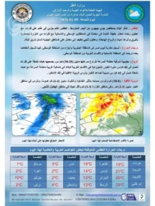 أعلنت هيئة الأنواء الجوية، اليوم الجمعة، حالة طقس العراق خلال الأيام المقبلة.