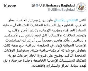 وشدد هاريس على أن الولايات المتحدة ستواصل التأكيد بوضوح على ضرورة تفكيك الميليشيات الإرهابية الموالية لإيران، والتي تهدد سيادة العراق واستقراره واقتصاده.
