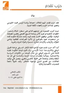أكد حزب تقدم، اليوم الثلاثاء، عدم تأييده ولا مشاركته بحكومة تقاد من شخصيات تعيد العراقيين لذاكرة "الصراعات الطائفية"