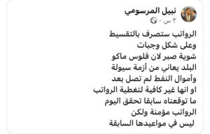 قال الخبير الاقتصادي نبيل المرسومي إن الحكومة ستلجأ إلى صرف رواتب الموظفين على شكل دفعات وتقسيطها خلال الفترة المقبلة، نتيجة أزمة سيولة مالية تمر بها البلاد.