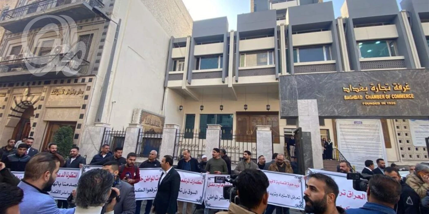 تظاهر عدد من تجار بغداد، اليوم الاثنين، أمام غرفة تجارة بغداد وسط العاصمة، مطالبين بتجميد تطبيق قرار مجلس الوزراء رقم (957) لسنة 2025 لمدة ستة أشهر.