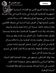ووفق التغريدة، أشار العبودي إلى أن لقاءات الخزعلي مع قيادات سياسية عليا في إيران كانت رسالة تضامن وتقدير للعراق في هذه المرحلة الحساسة، مؤكدًا أن الدعم الإيراني للعراق “شامل وواضح”، وأن أي تصريحات عن تدخل إيراني في اختيار رئيس الحكومة غير دقيقة.