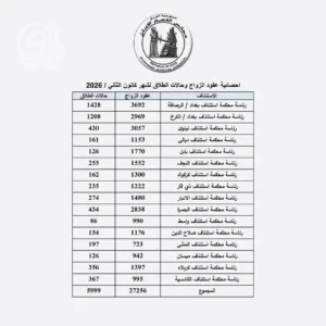 أعلن مجلس القضاء الأعلى في العراق، اليوم الثلاثاء، تسجيل 27 ألفاً و256 عقد زواج مقابل 5 آلاف و999 حالة طلاق في عموم محاكم الاستئناف خلال شهر كانون الثاني 2026.