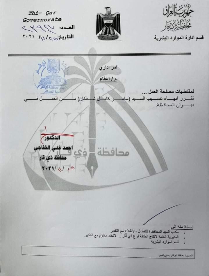 وثائق: محافظ ذي قار يتخذ جملة اعفاءات من المناصب