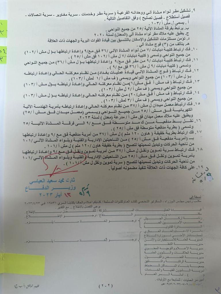 جاء ذلك بحسب وثائق من وزير الدفاع تلقت (المدى) نسخة منها، الوثائق ادناه:
