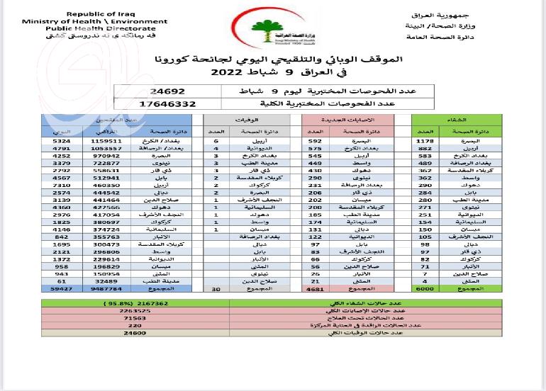 وأضاف البيان، أن "حالات الوفاة الجديدة بكورونا بلغت (30) حالة في عموم محافظات البلاد"، لافتا إلى أن "الاشخاص الذين تلقوا اللقاح خلال 24 ساعة بلغ عددهم (59427)".