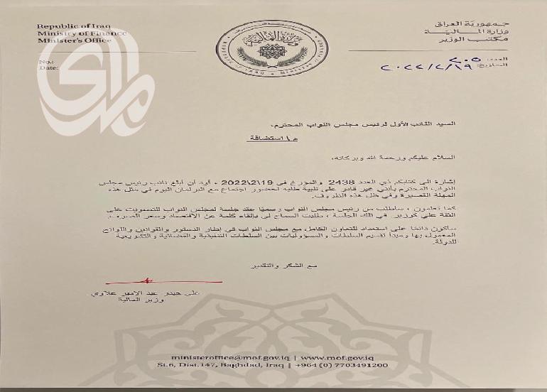 ارسل وزير المالية عبد الامير علاوي، كتابا الى رئاسة البرلمان يطلب فيها عقد جلسة بشأن التصويت على الثقة عليه.