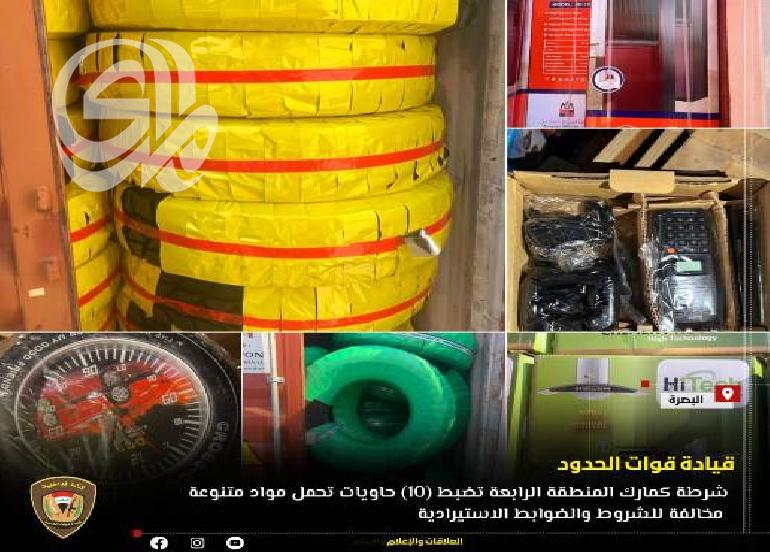 وقال بيان للمديرية تلقت (المدى) نسخة منه إنه "تمكنت مفارز مركز شرطة كمرك أم قصر الشمالي التابعة لمديرية شرطة كمارك المنطقة الرابعة من ضبط (10) حاويات مخالفة للشروط والضوابط الاستيرادية تحتوي على (إطارات، براد ماء، ملابس، ساحبة هوائية، أقلام، ساعات، دراجات نارية)".
