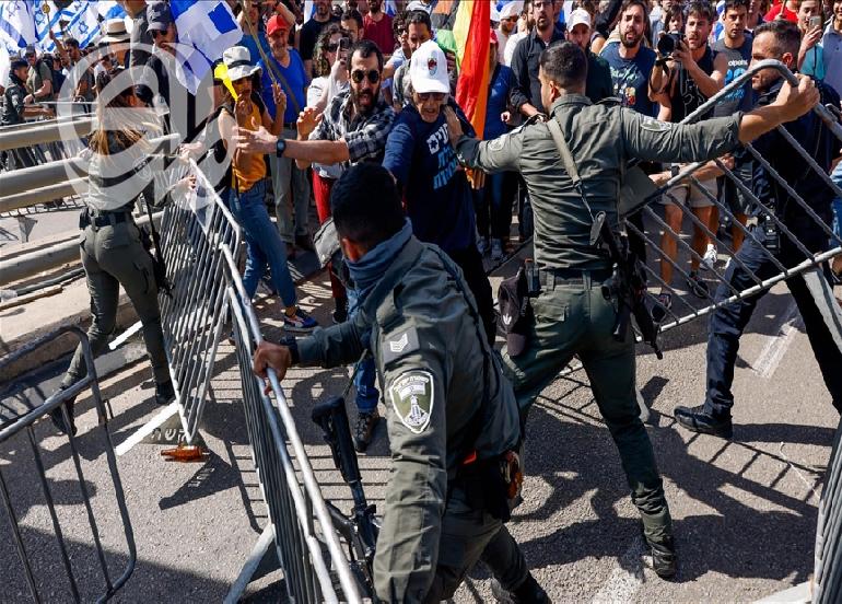 أعلن قادة الاحتجاجات ضد خطة الحكومة الإسرائيلية لإضعاف جهاز القضاء، صباح اليوم الإثنين، عن أنه "سيتم شلّ الدولة" إلى حين إيقاف تشريعات الخطة، ودعوا إلى مظاهرة خارج مبنى الكنيست، ويأتي ذلك غداة ليلة صاخبة أعقبت إعلان نتنياهو عن إقالة وزير الأمن، يوآف غالانت، وأغلق خلالها متظاهرون شوارع ومفترقات طرق مركزية وجرت مواجهات بينهم وبين قوات الشرطة التي فرقتهم بالقوة.